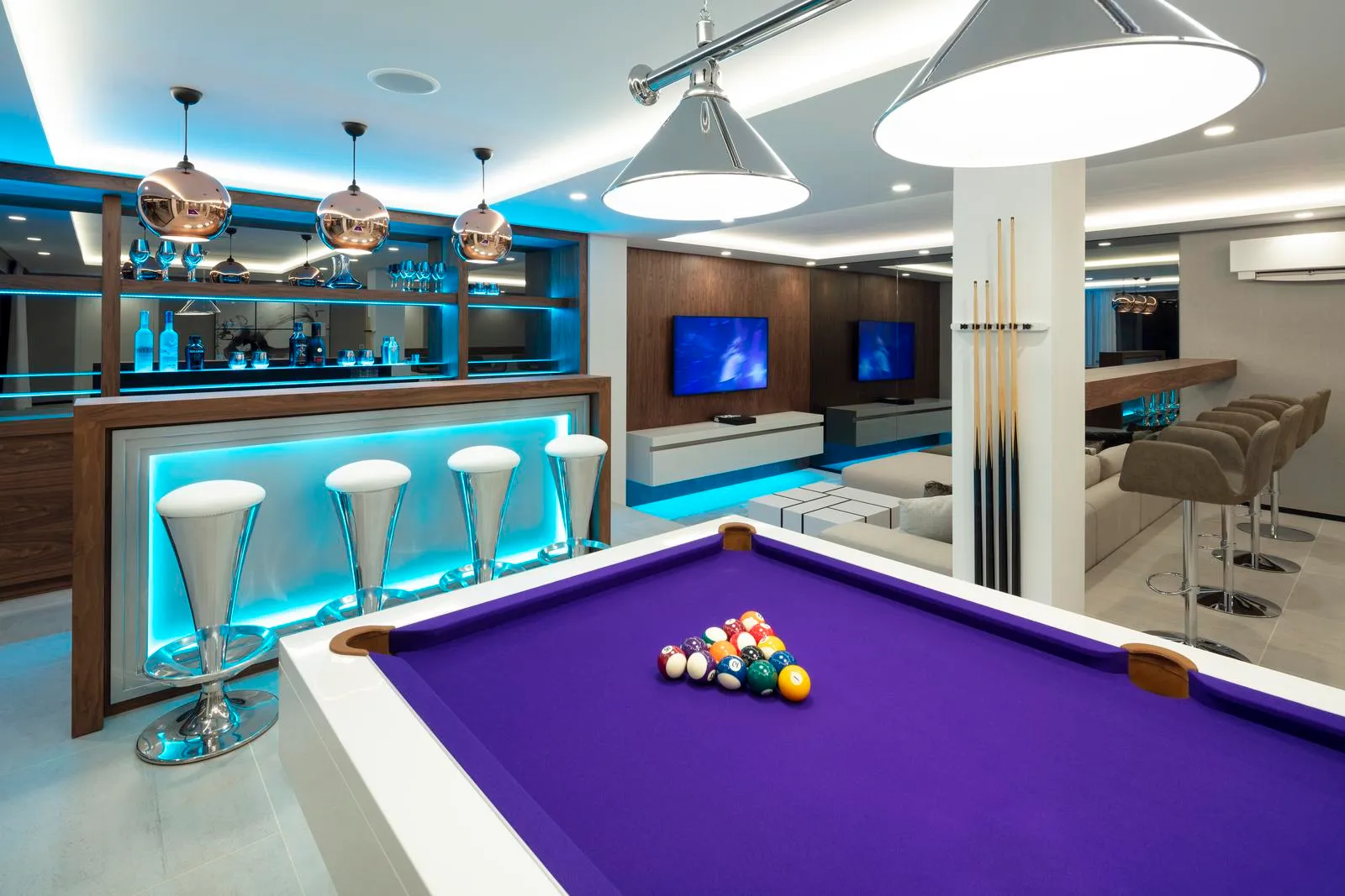 Underneath, there’s the remainder of the en suite bathrooms, all with step-free access to a private lush green lawn. There’s also a proper bar with a pool table, a temperature-controlled bodega (wine cellar) and a movie-viewing area to round off the entertainment options.